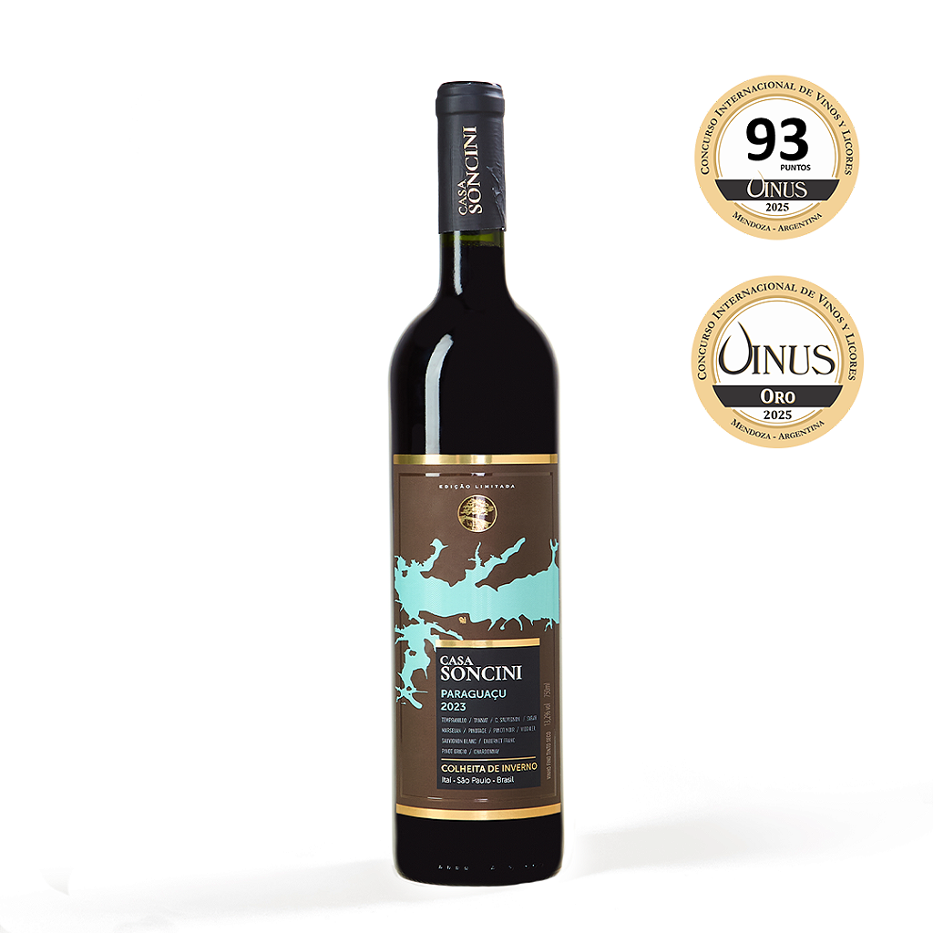 Corte complexo que expressa o melhor de cada casta através da dupla poda e colheita de inverno. Coloração vermelho-rubi brilhante, acidez equilibrada e aromas intensos de frutas vermelhas com retrogosto agradável.